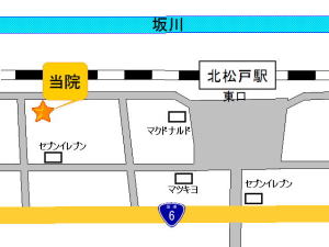 線路沿いの道をそのまま東京方面(松戸駅方面)へ直進すると、左側に10階建てマンションが見えてきますので、1階の「ひびき鍼灸院・整骨院」の看板を目印にお越しください。